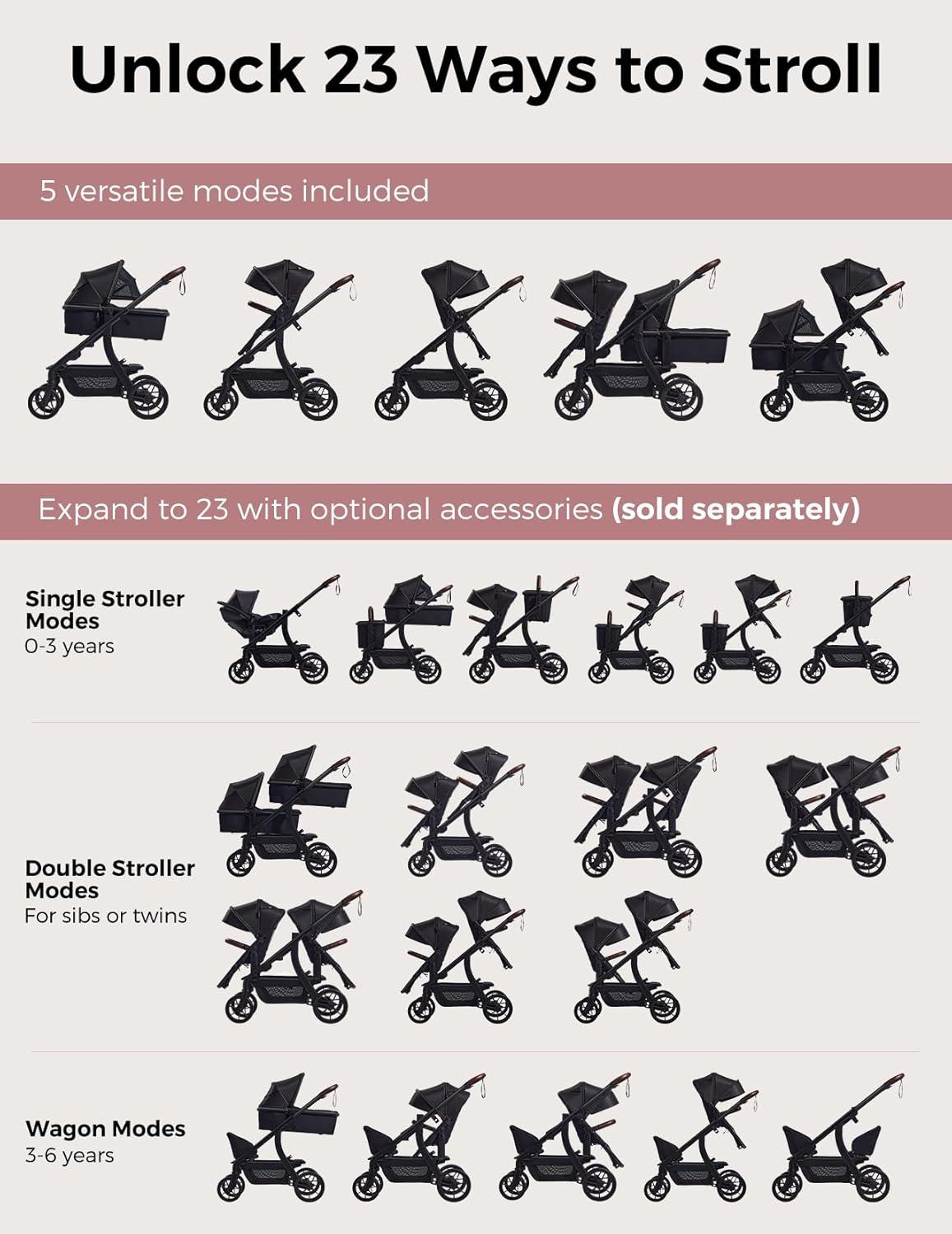 Unlock up to 23 configurations: This versatile stroller easily converts from a bassinet/single stroller to a double stroller, growing with your baby and your family from birth to age 3. With a variety of accessories (sold separately), it supports up to 23 configurations, and in wagon mode (wagon seat sold separately), it grows with your baby to age 6.