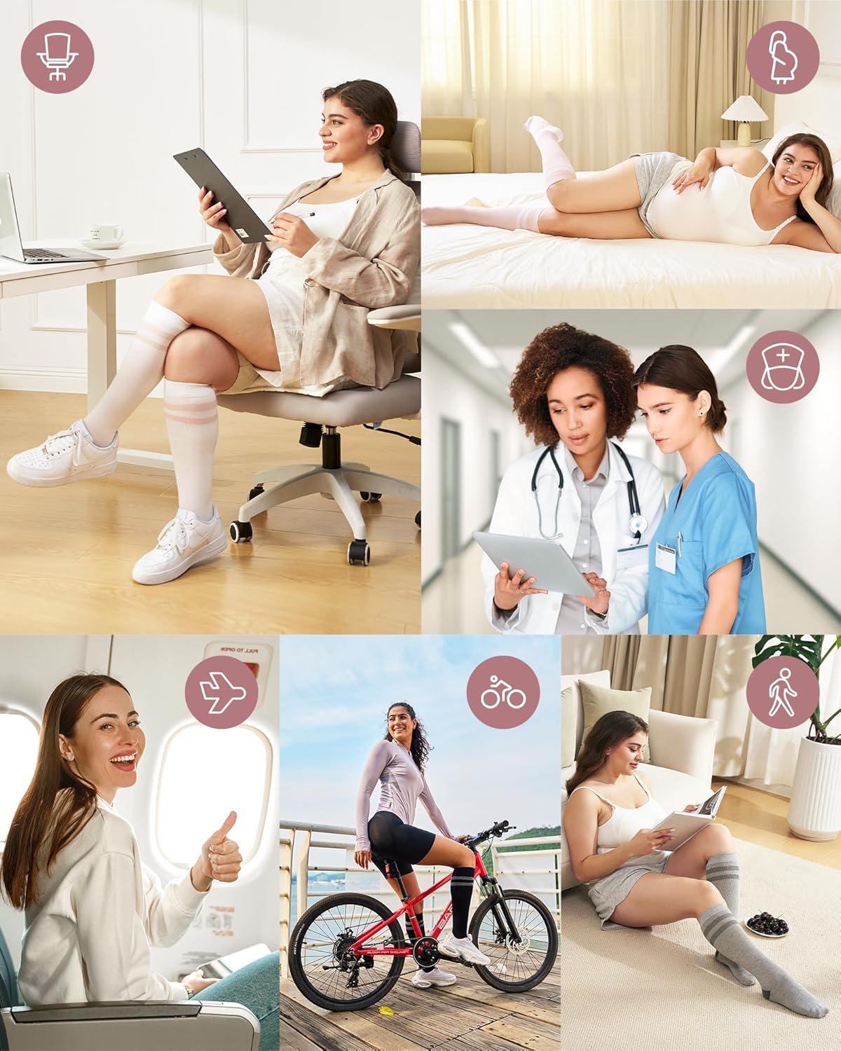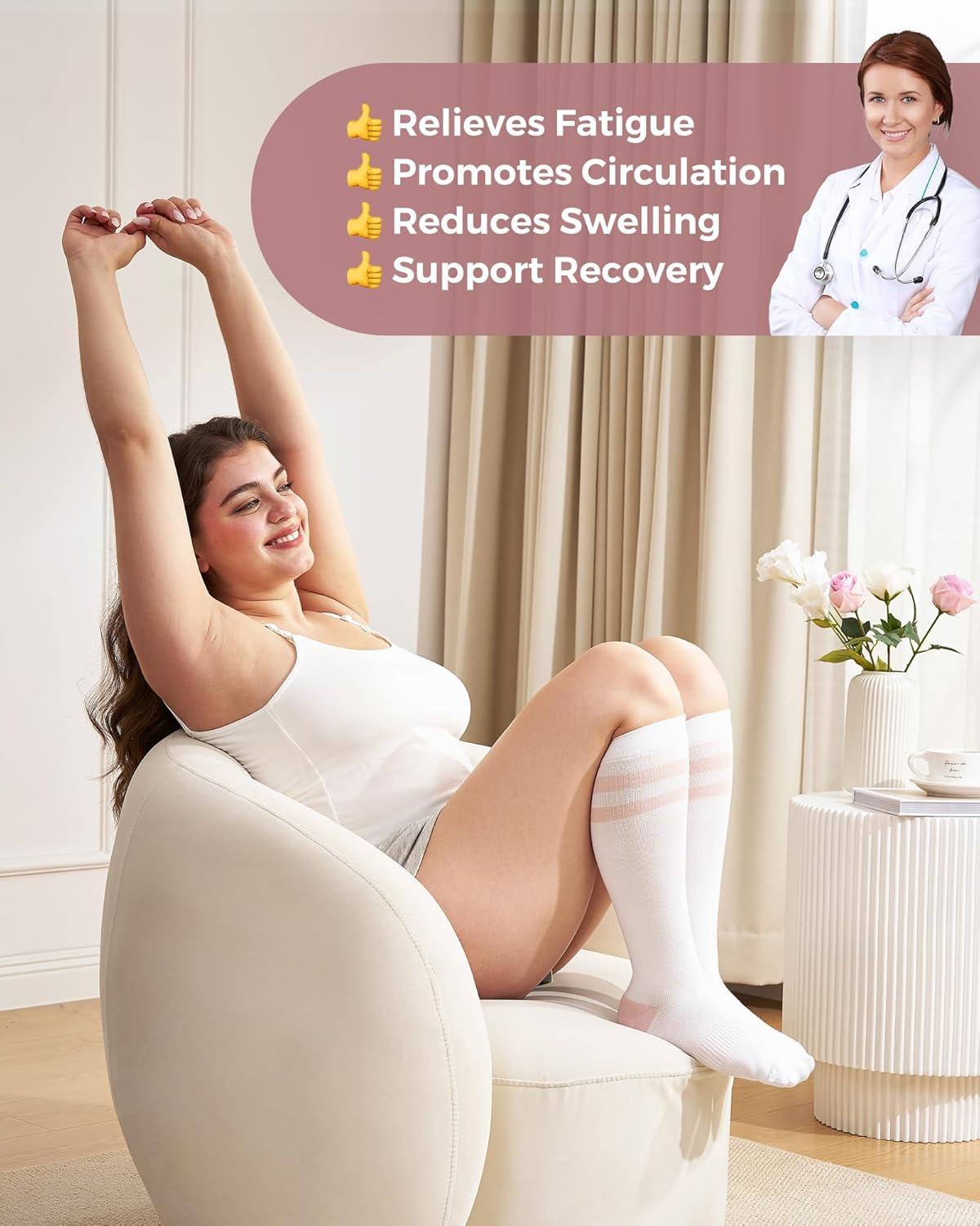Momcozy Compression Socks for Women Wide Calf, 15-20mmHg Knee High Support Socks for Pregnancy, Nurses, Travel, Flying(White/Light Gray)