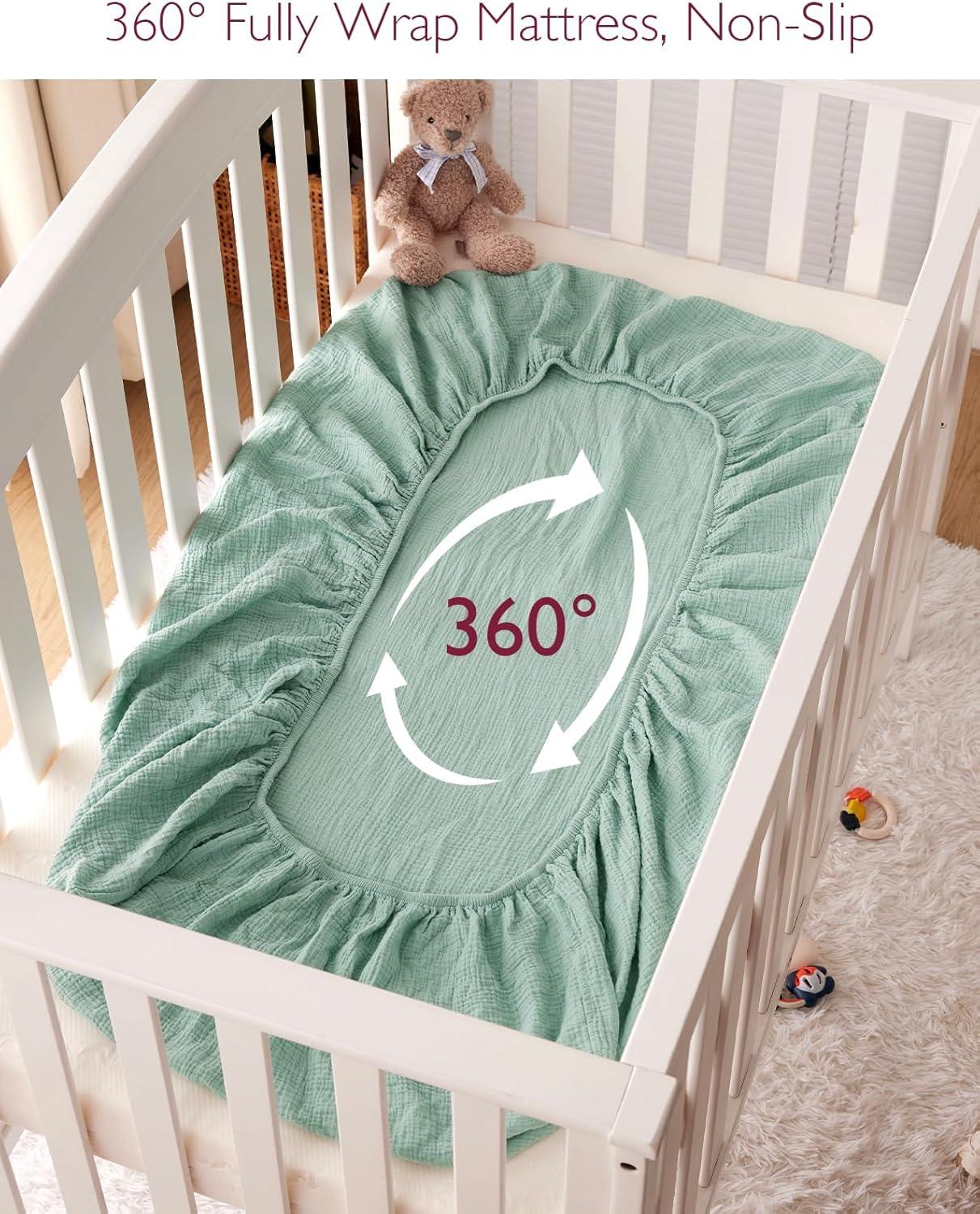 【Baby Sleep Soundly with Moisture-Absorbent and Breathable Fabric】Breathable and lightweight double-layer gauze boys and girls mattress crib sheet let baby breathe through bed sheet and mattress, allows for proper air circulation and doesn’t trap heat to help regulate baby's body temperature while they sleep. Absorbs extra moisture in the air promptly to keep baby body fresh and dry, suitable for all seasons, warm in winter and no hot sleeping in summer.
