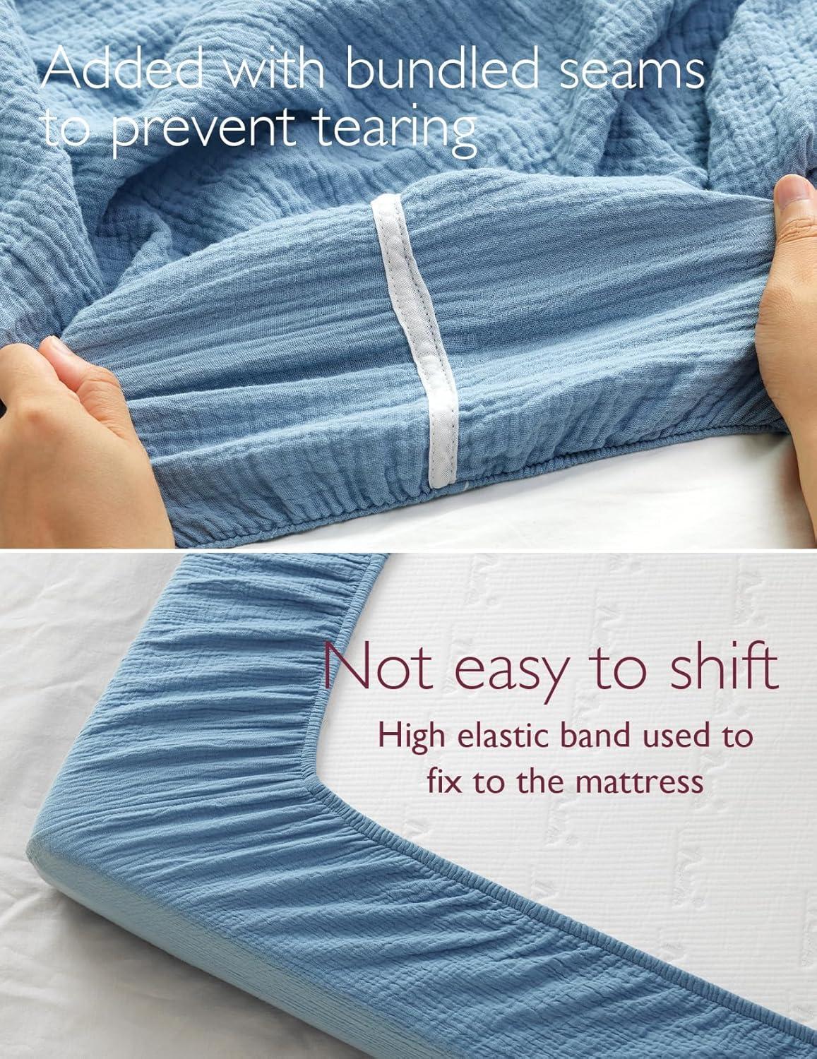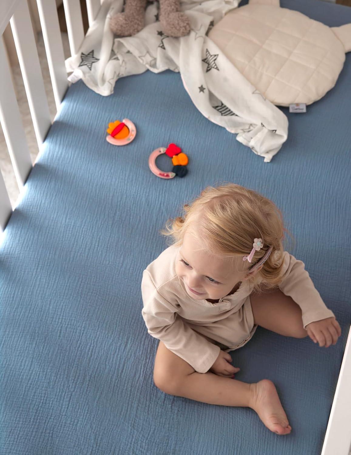 【Baby Sleep Soundly with Moisture-Absorbent and Breathable Fabric】Breathable and lightweight double-layer gauze boys and girls mattress crib sheet let baby breathe through bed sheet and mattress, allows for proper air circulation and doesn’t trap heat to help regulate baby's body temperature while they sleep. Absorbs extra moisture in the air promptly to keep baby body fresh and dry, suitable for all seasons, warm in winter and no hot sleeping in summer.